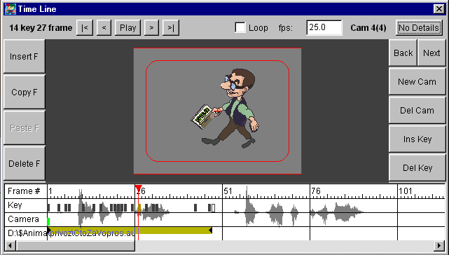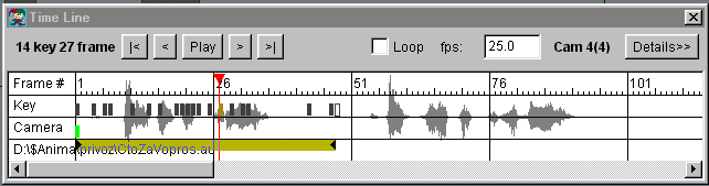 You can drug keyframes along time line on the "Key" stripe, as well cameras keys. If a sound AU file is loaded, you will see the audio represented here. |
